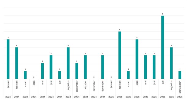Een keer per maand wordt er door het CBS een update gepubliceerd van het aantal faillissementen. Hieronder vind je een staafdiagram van het aantal faillissementen per maand vanaf 2024 tot en met nu (bron:CBS)